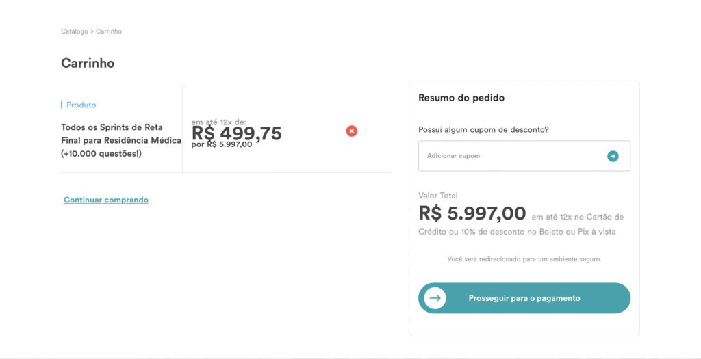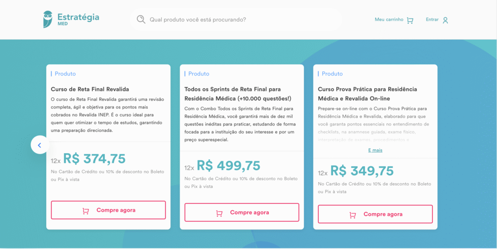 Acesse a página de cursos do Estratégia MED e escolha o produto desejado, podendo ser um ou mais dos diversos cursos presentes nesta página, indo desde banco de questões, até as especializações